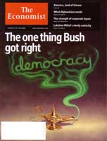 The other day I noted the unintentionally ironic headline, "The President is a dolt, so how can America be such a success?" In the same spirit, check out the cover of the latest Economist: The one thing Bush got right (democracy). Yes, well, I guess he only got one thing right, eh? But at least it was important, in fact, it was the most important thing. Of course, reasonable people might differ about whether this was the only thing he got right. After all, if the President is a dolt, how can America be such a success :)