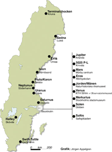 Pretty cool: the Sweden Solar System. "The Sun is represented by the Ericsson Globe in Stockholm, the largest hemispherical building in the world. The inner planets can also be found in Stockholm but the outer planets are situated northward in other cities along the Baltic Sea." I love that they've embraced the "outer planets" like Eris, Sedna and Quaor.